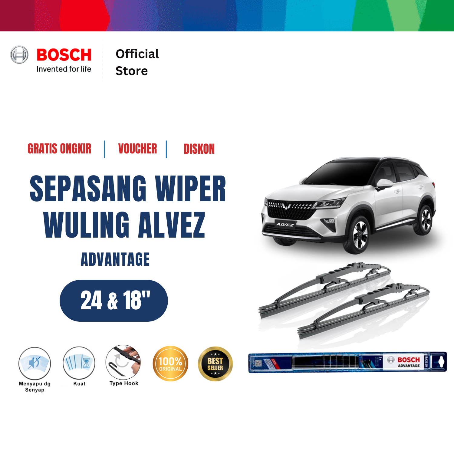 Bosch Sepasang Wiper Frameless New Clear Advantage Mobil Toyota Landcruiser Size 24 dan 22 Inci Harga 226,015 rupiah*Gratis Ongkir
